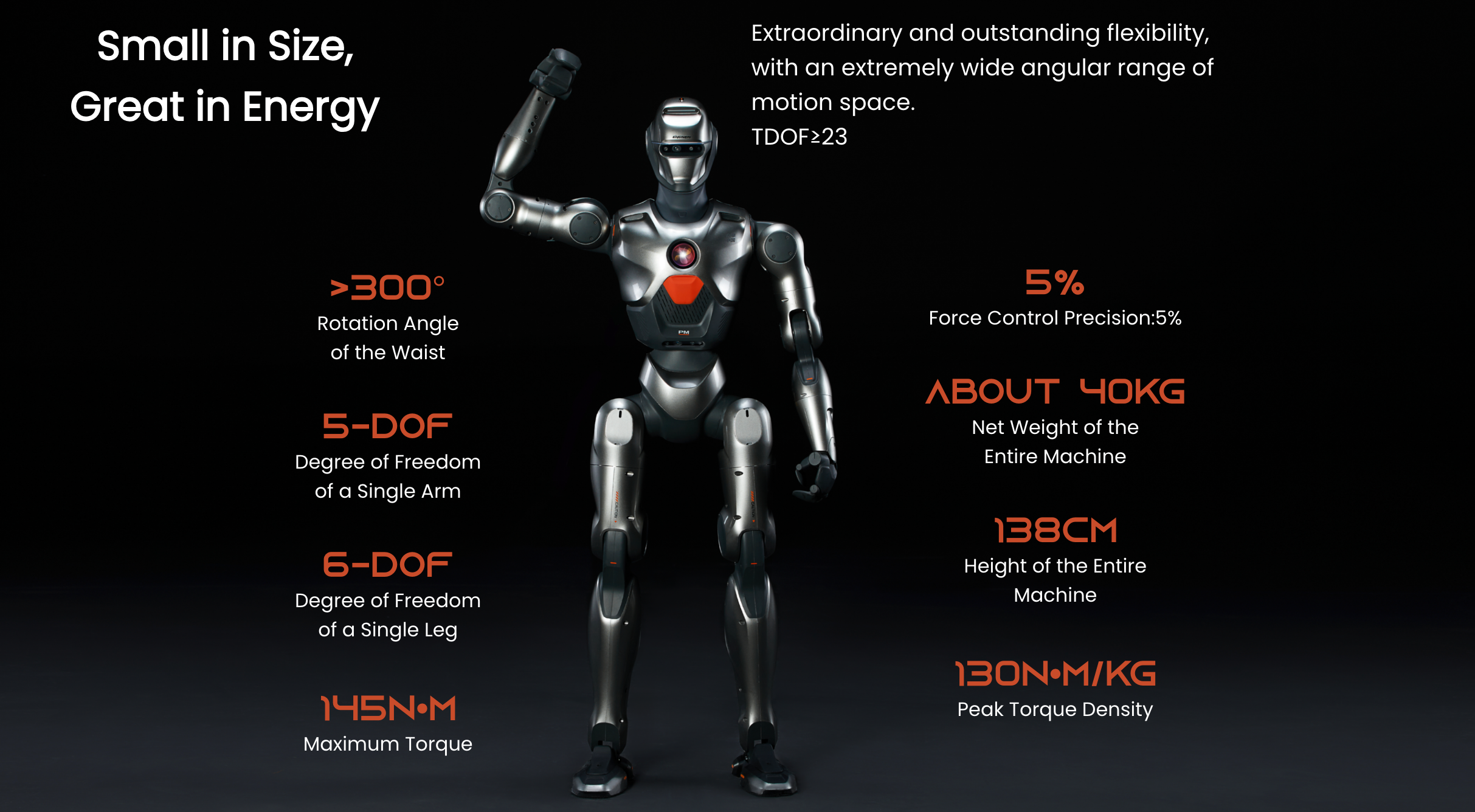 The SE01 is EngineAI’s flagship humanoid, full-sized at 170 centimeters and weighing in at 55 kilograms, designed for industrial applications that require both precision and dexterity. With 32 degrees of freedom and harmonically optimized joints, it can perform squats, push-ups, and fluid walking patterns while navigating cluttered spaces with surprisingly human-like grace. Its deep learning algorithms allow it to adapt to dynamic environments, making it ideal for material handling, precision assembly, and other repetitive tasks where intelligence and subtle movement matter. Seeing the SE01 in motion is mesmerizing; it’s easy to forget it’s a machine, and when it briefly strolled through the crowds at the 2024 IAA Mobility in Munich, it turned heads not because it was flashy, but because it moved with purpose.